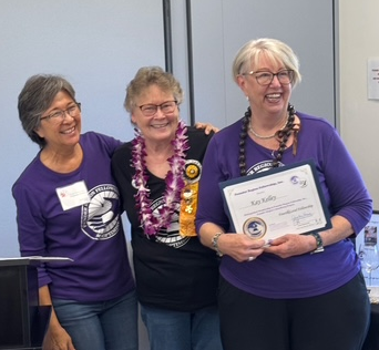Director Kay Kelley is surprised with her 4th Level at the District 5 meeting, awarded by Fellowship chair Vicki and director Cindy.